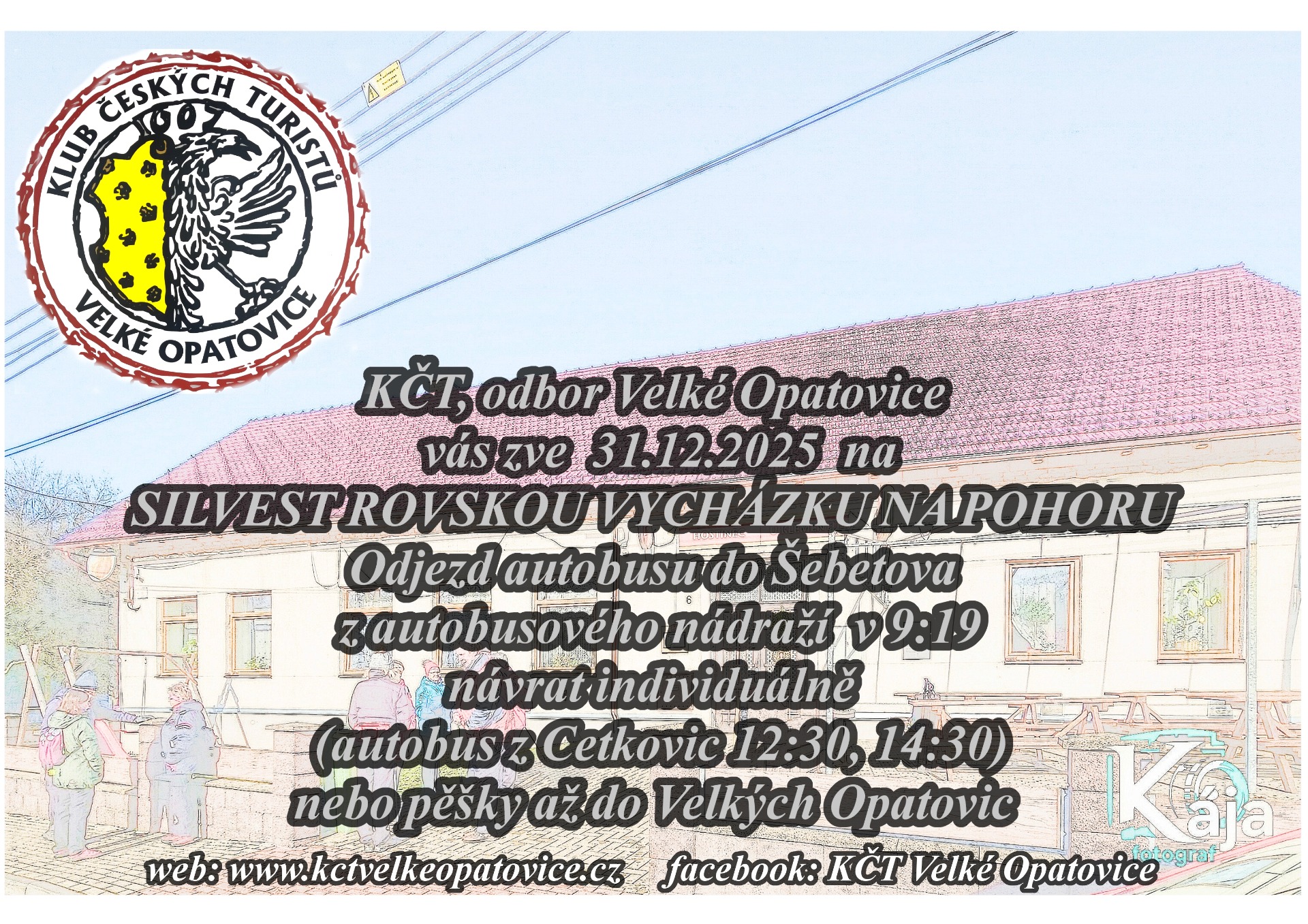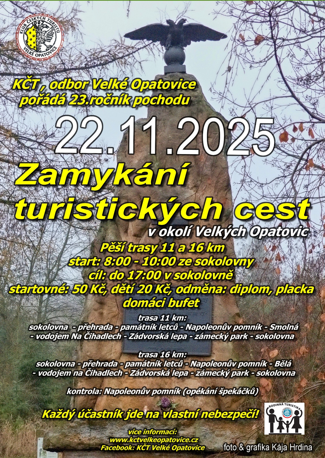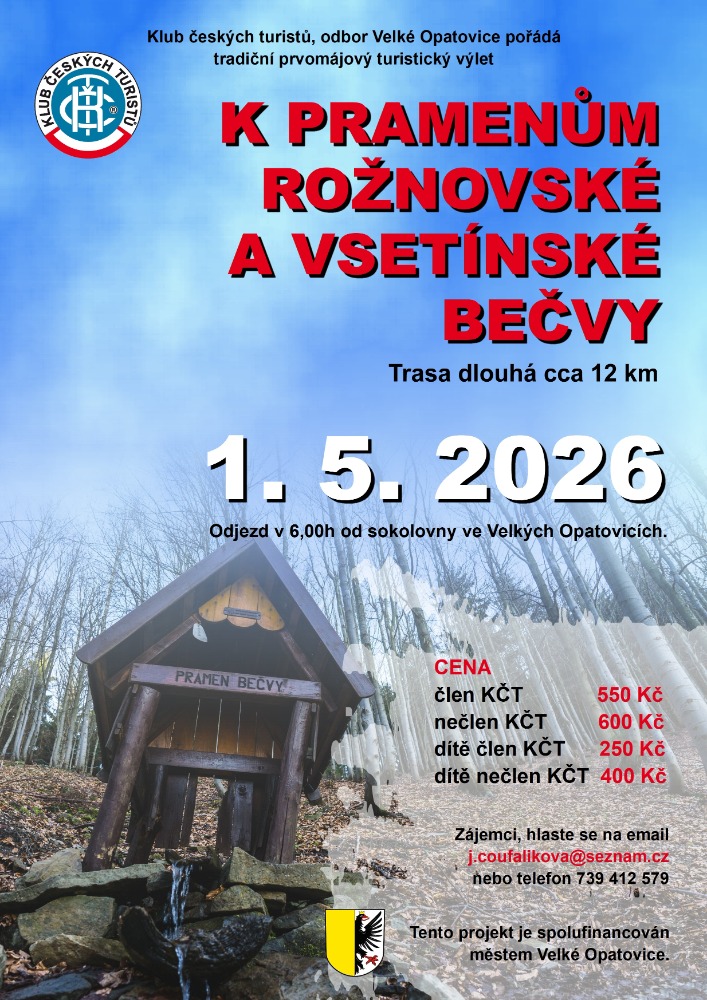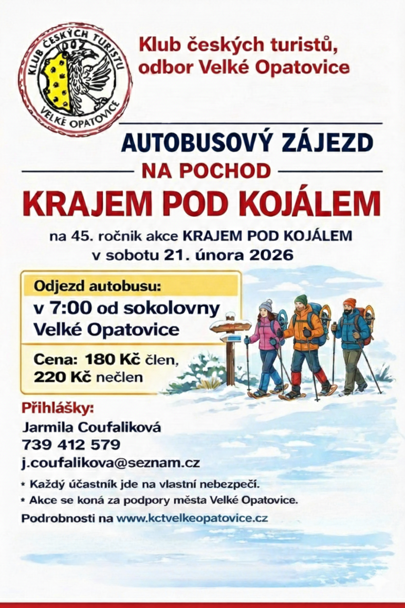 Klub českých turistů, odbor Velké Opatovice a KČT Moravská Třebová vás srdečně zvou na vycházku Rudické propadání!Kdy?V sobotu 18. října 2025Co nás čeká?Trasa Moravským krasem z Rudic do Jedovnice, dlouhá přibližně 10 km.Odkud vyrážíme?Odjezd autobusu v 8:00 od Sokolovny ve Velkých Opatovicích.Cena: * člen KČT: 190 Kč * nečlen: 210...